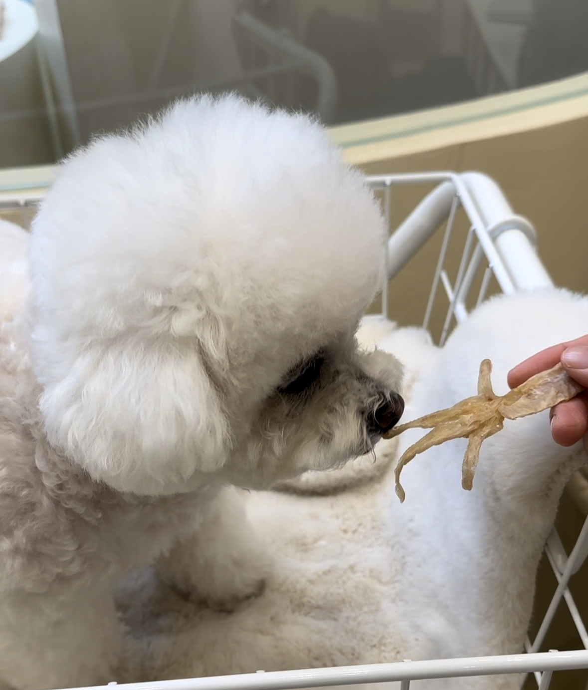 항상 닭가슴살만 먹던 미료에게 오늘 신세계를 보여주었다. 바로 무뼈닭발 간식이었다. 닭발을 요리해먹을 때 미료가 항상 먹고 싶어했는데 무뼈닭발이 있었다니 왜 이생각을 못했을까! 무뼈닭발을 건조시켜서 강아지 간식으로 만든 수제 간식이었다. 강아지 기호도 좋고, 닭발에는 닭가슴살에 비해 단백질보다는 콜라겐이 듬뿍 들어있어서 강아지 피부과 골격근에 좋은 간식이다. 이제 자주 줘야겠다