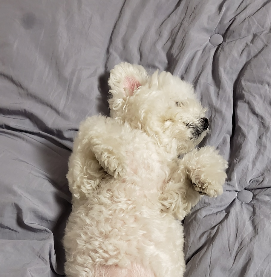 제가 가장 자랑스럽게 생각하는 순간 중 하나는 미료가 낮잠을 자는 동안 벌린 자세로 뻗은 것을 발견했을 때입니다. 미료는 많은 개들과 마찬가지로 다양한 수면 자세를 취하며, 각각의 자세는 다른 의미를 전달합니다.