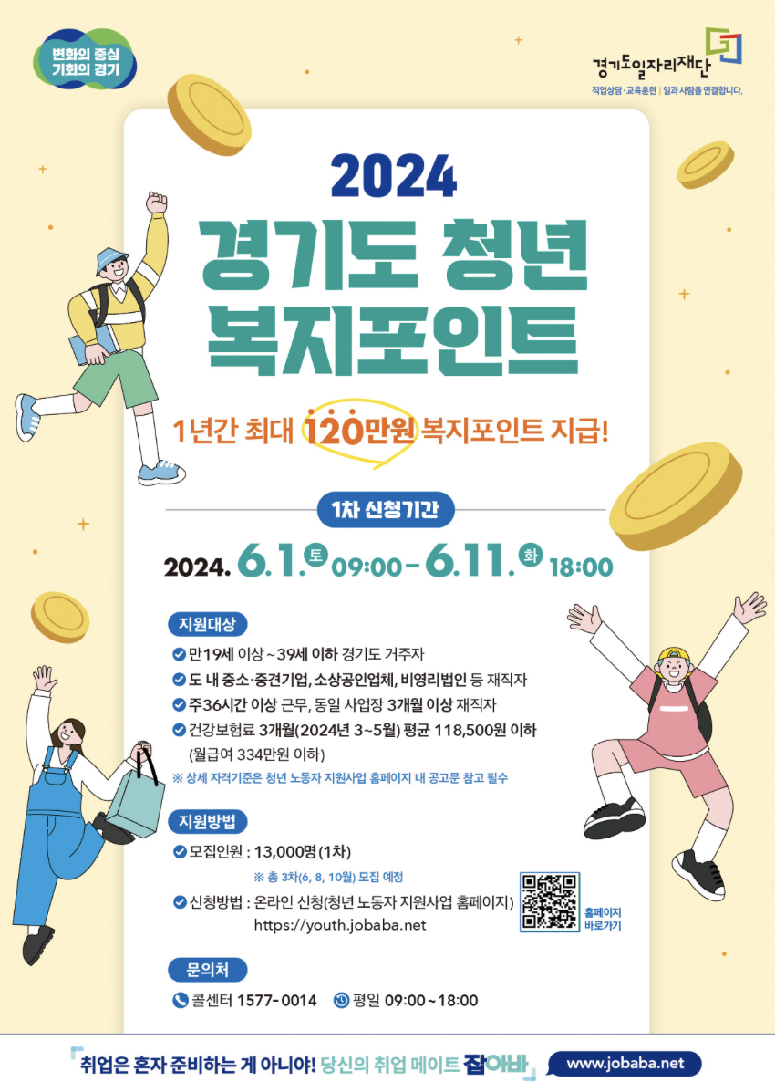 만 19세 이상 ~ 만 39세 이하 경기도 청년 근로자를 대상으로 1년간 120만원(포인트)을 지급하는 정책이다